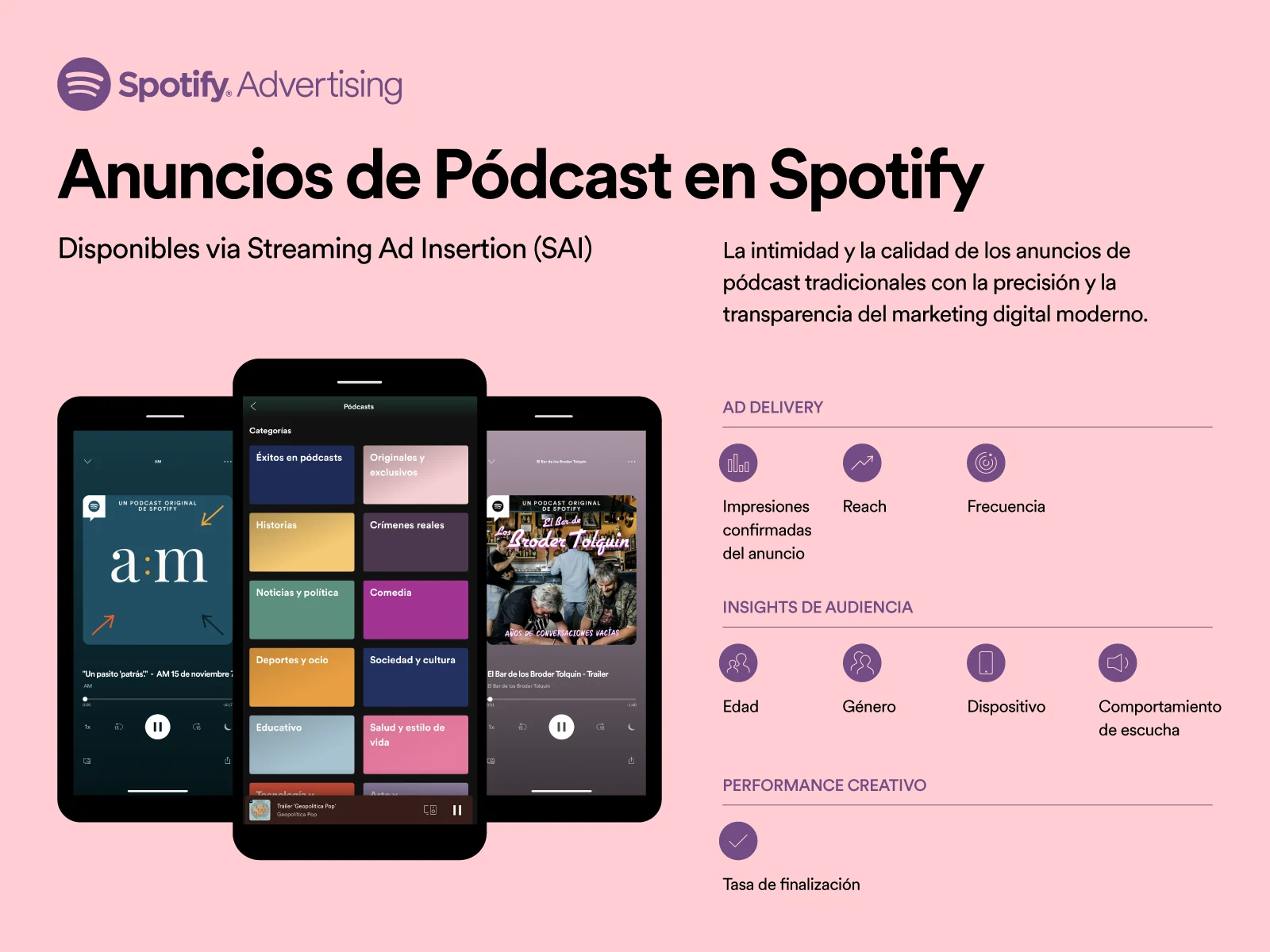 Gracias a la solución título por título, los anunciantes pueden asociar su marca con determinados pódcasts y presentadores dentro del catálogo de contenido original y exclusivo de Spotify. Además, pueden elegir si prefieren anuncios leídos por locutores profesionales o, en determinados pódcasts, que sea el presentador quien los lea. Los anuncios de pódcasts se entregan a través de la Streaming Ad Insertion (SAI), la tecnología publicitaria exclusiva de Spotify. SAI ofrece la calidad y la familiaridad de la publicidad tradicional de pódcasts con la precisión propia del marketing digital moderno. Gracias a esta tecnología, pueden ofrecer nuevas oportunidades de medición de la publicidad de pódcasts, como impresiones confirmadas de los anuncios, insights de primera mano sobre la audiencia y la medición del desempeño de la creatividad.